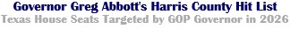 Governor Greg Abbott is targeting seven Texas House seats that Democrats control in Harris County with a slate of challengers that features one who did time in the local lockup after a handful of misdemeanor arrests as the lone Republican in the only district the GOP appears to have a realistic shot at winning in 2026.