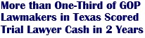 Lawsuit reform group has ample cause for fast-growing angst as analysis shows 36 House and Senate Republicans with funds from plaintiffs bar pair, PAC and firm or combo including dozen freshmen with running count near $1.3 million and rising with primaries under way. more