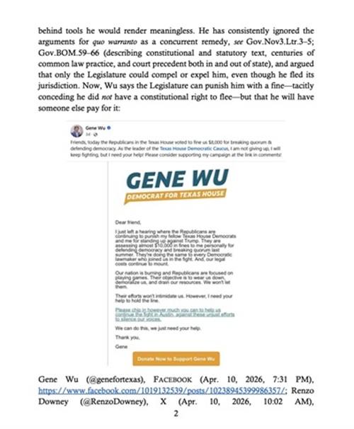 But the case that Abbott is making against Wu has a monstrous hole that Ezell did not try to bridge in the communique that he fired off in an attempt to turn up the heat on the high court. More than 50 other House Democrats participated in the disappearing act on redistricting in 2025 - and they face the same fines and sanctions that Abbott says should disqualify Wu from serving in the Legislature.